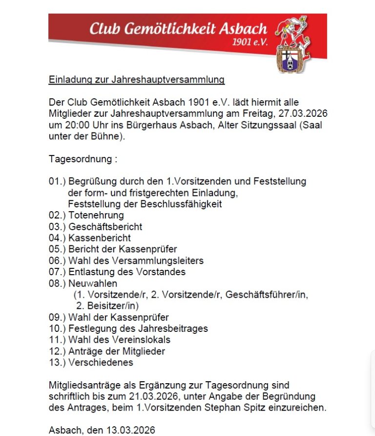Wie schon seit vielen Jahren feierte der Club Gemötlichkeit Asbach 1901 e.V. am dritten Wochenende im Jahr sein Jeckes Wochenende. Am Freitag den 16.01.2026 startete