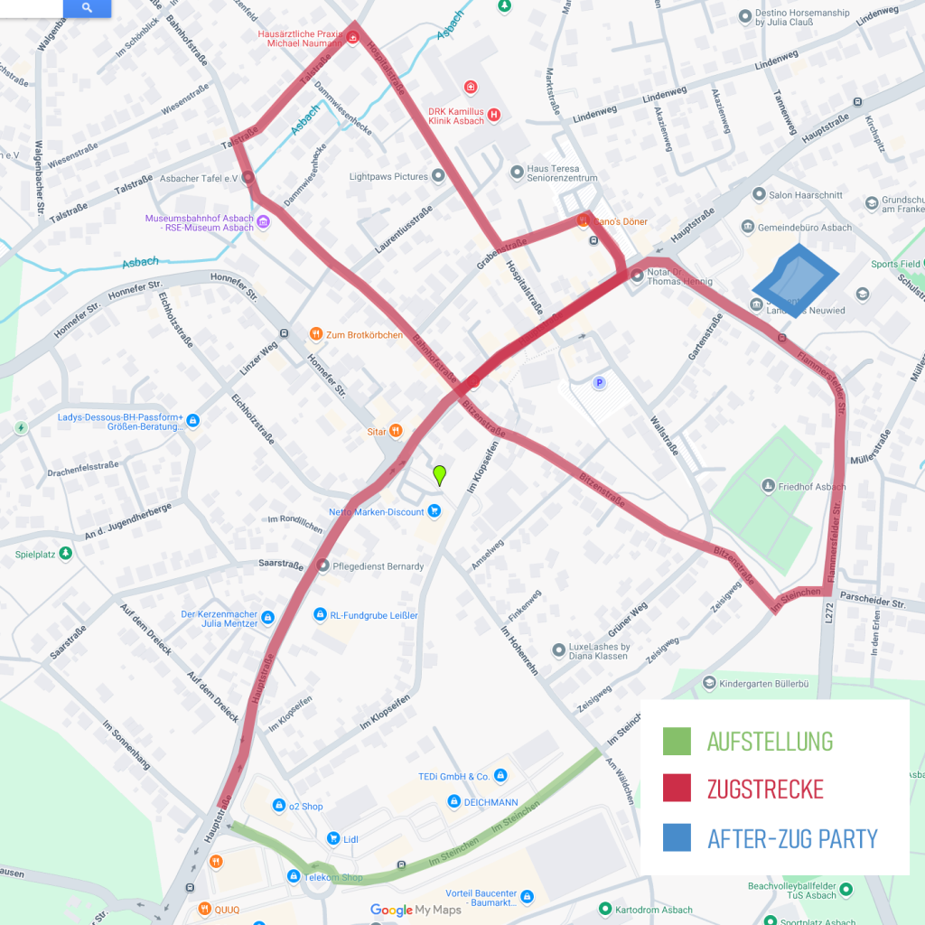Zugstrecke: Hauptstraße ab Zufahrt Vorteil Center – Flammersfelderstraße – Bitzenstraße – Haupstraße – Marktplatz – Grabenstraße – Hospitalstraße – Talstraße – Bahnhofstraße – Hauptstraße – Auflösung Marktplatz